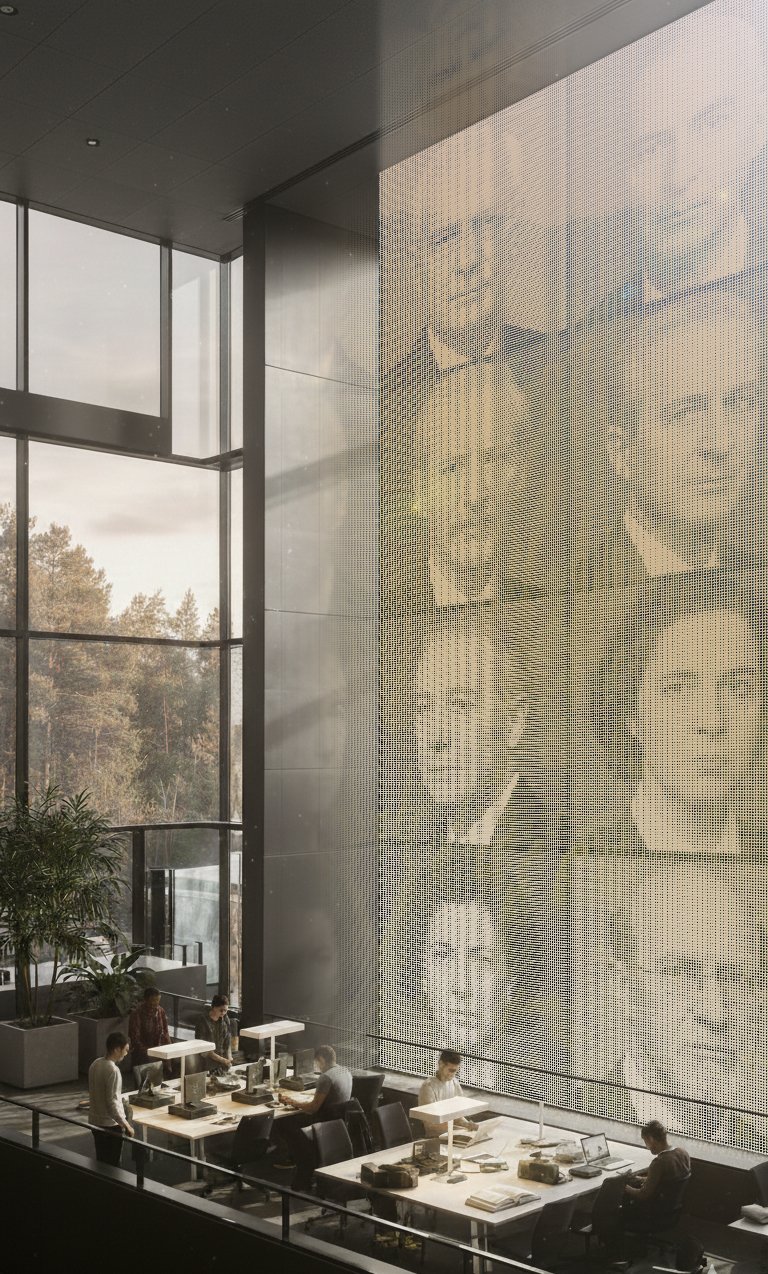 The parametric laser cut facade design began with a raster image containing portraits of Nobel Prize laureates arranged in a grid.